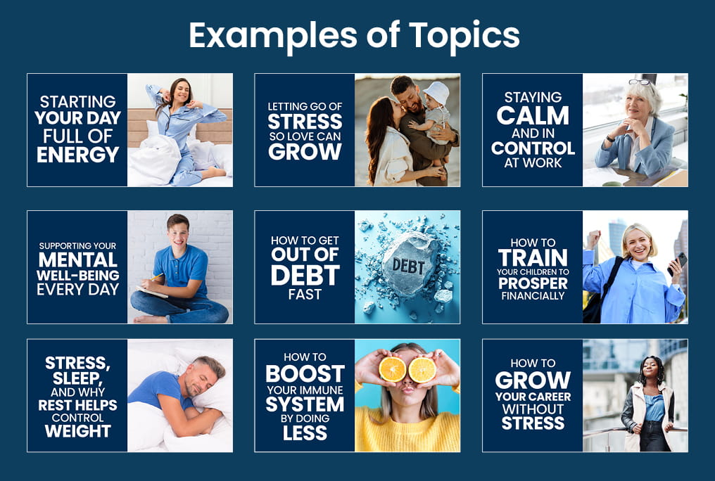 These simple videos provide actionable stress-busting strategies for all critical areas of life, delivered weekly in 3-5 minute segments.